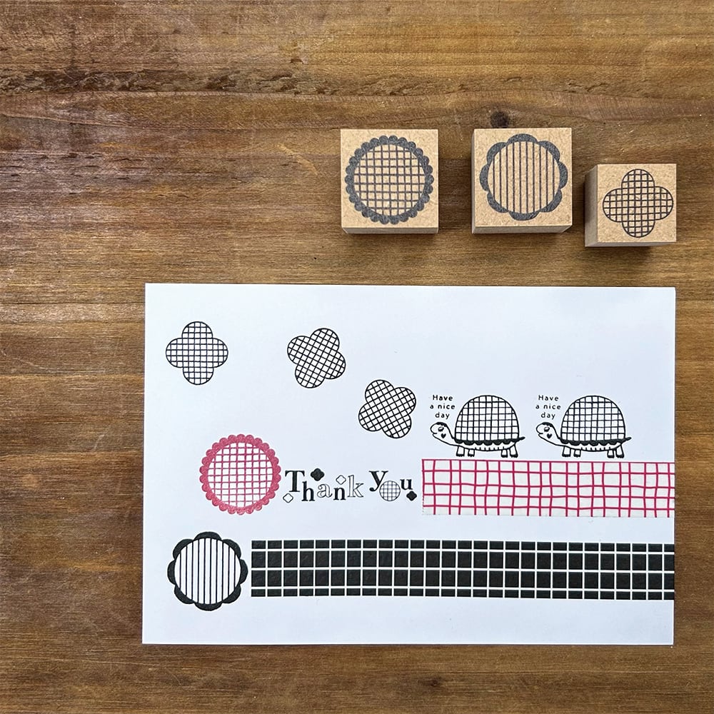 チェック+、花模様チェック、アジサイ、雨、のはんこと一緒にスタンプするのもおすすめです。